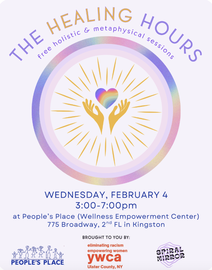 The Healing Hours is a three-way collaboration between the YWCA Ulster County, The Wellness Empowerment Center at People’s Place, and Spiral Mirror to bring free holistic and metaphysical healing sessions to the community. It is a passion and mission for all of us to connect the community with these heart-led offerings.